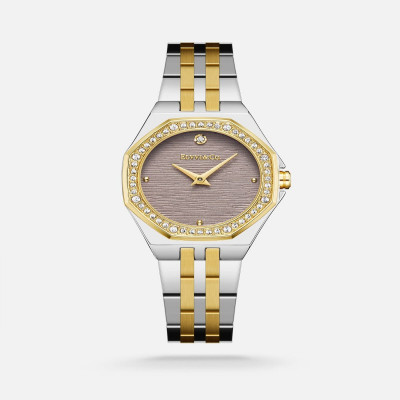 نوع الإطــار: ستيل, لون الإطــــار: ذهبي و فضي , مقاس الإطـار: 27 MM , نوع الســوار: ستيل , لــون الســوار: ذهبي و فضي , لون الميناء: رمادي , مقاومة المـــاء: نعم