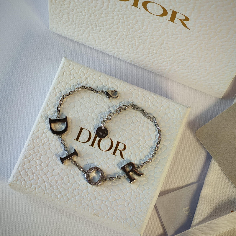 اسوارة أنيقة مطلية باللون الفضي مع حروف DIOR الفاخرة، يزين حرف O بفصوص كريستال لامعة تضيف لمسة فخامة مميزة.